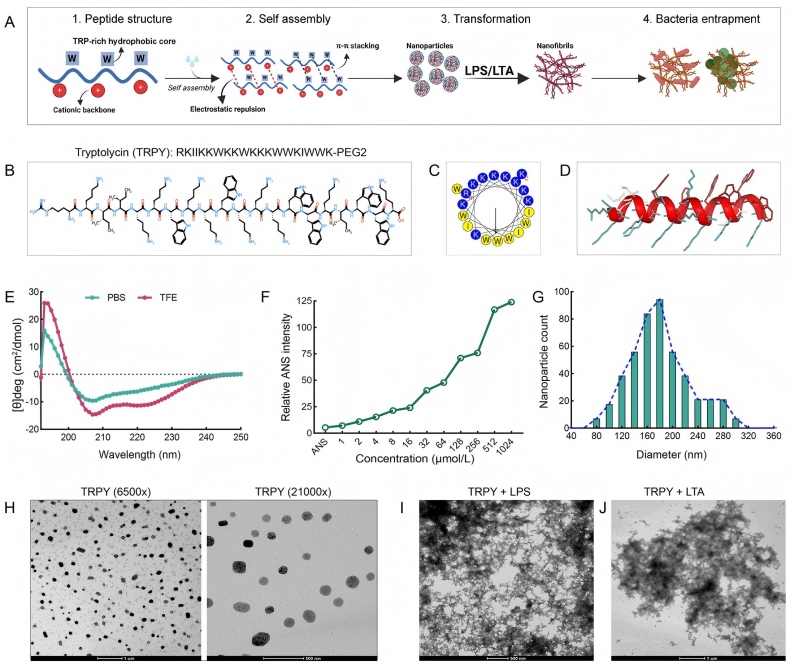 近日,中国科学院昆明动物研究所赖仞研究员团队在《动物学研究》(Zoological Research)上发表了表题为“Integrating a cationic backbone with a hydrophobic core: A structure-function strategy for designing self-assembling antimicrobial peptides with enhanced activity”的重要研究,提出一种基于“结构-功能”策略的新型自组装抗菌肽(AMP)设计方法,并成功开发出Tryptolydin(TRPY)的先导肽。该肽整合阳离子骨架与色氨酸富集的疏水核心,通过色氨酸之间的π–π堆积作用驱动其自组装成均匀的纳米颗粒。当这些纳米颗粒近细菌,会识别细菌表面的特定成分(如LPS或LTA),迅速从纳米球伸展、聚集,形成致密的“纳米纤维网”,从而实现对多种耐药菌的高效杀灭。值得注意的是,TRPY能有效清除抗生素难以清除的生物膜,对持留菌也具有高效杀灭作用。TRPY在体内外具有良好的生物相容性,同时在动物模型中展现出良好的治疗效果。为应对全球抗菌素耐药性?;峁┝诵滤悸贰?/span>